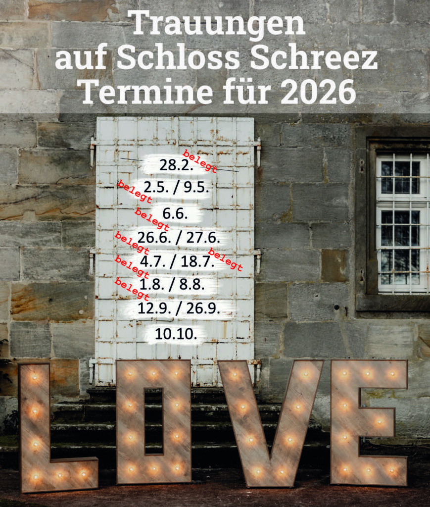 Mit unserem Partner iTüpfelchen bieten wir ab sofort Trauungen auf Schloss Schreez an! Näheres finden Sie auf den Seiten des iTüpfelchens.